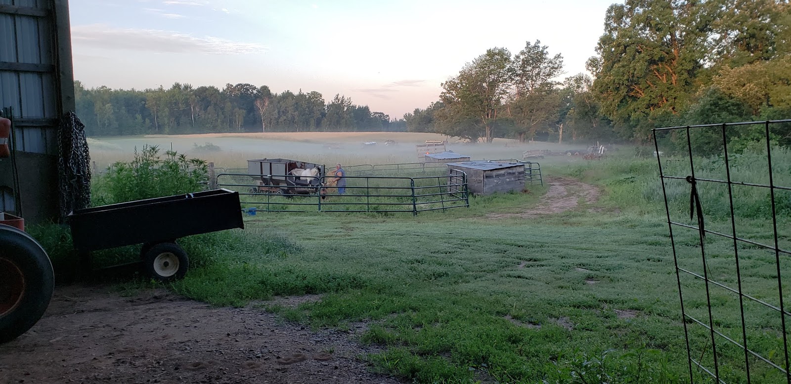 And last, another view from the milking stand. The lads have moved up closer to the house for the week, and their play wagon came along. Kevin is even in there providing some bedding in it as both the guys spend quite a bit of time in there.