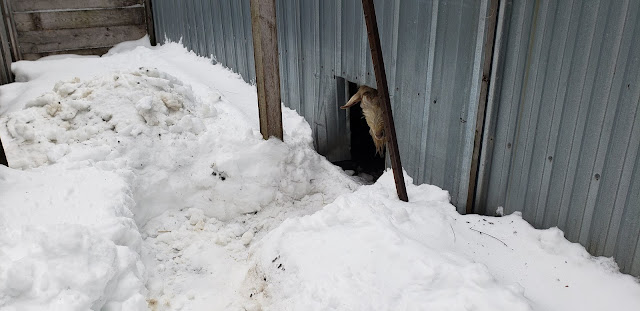 A few years ago, one of my very first blog posts was called Rescuing the Avalanche Victims - or something like that. The snow comes off the north roof of the pole barn and blocks the little goat door. That year I had to tunnel them out and it took most of a day. This time wasn't that bad.